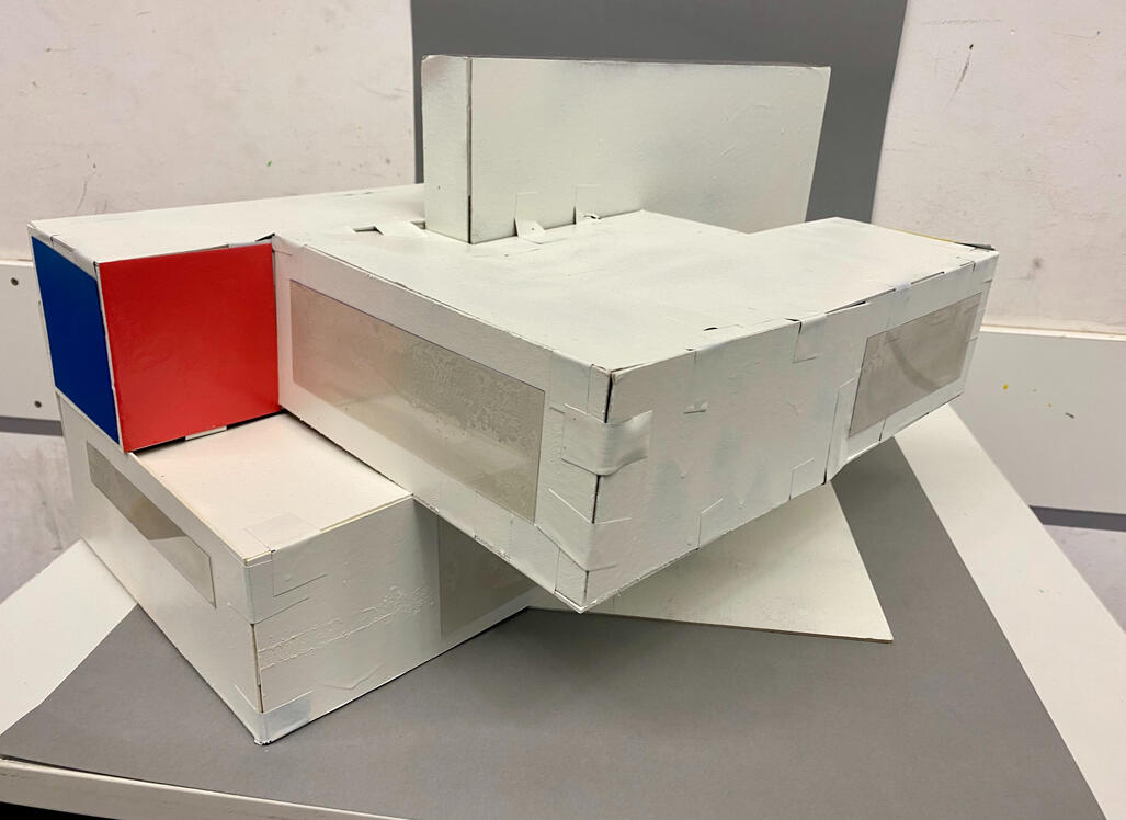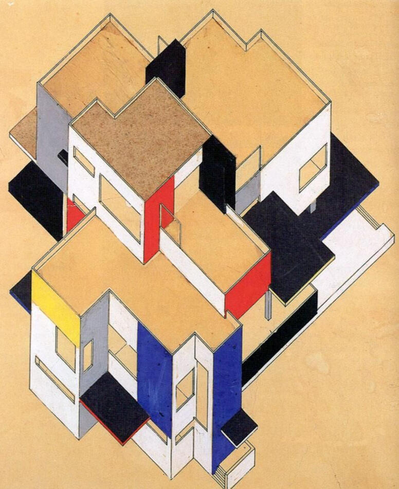 Theo van Doesburg (1883–1931) war ein niederländischer Maler, Schriftsteller, Architekt und Kunsttheoretiker sowie Mitbegründer der abstrakten Malerei. Er gründete 1917 die Gruppe „De Stijl“ und beeinflusste das Bauhaus in Weimar.Eines seiner wichtigsten Projekte war das „Maison particulière“, das er mit Cornelius van Eesteren entwarf. Das Gebäude bricht mit traditionellen Raumstrukturen, indem es offene Flächen schafft und durch Primärfarben sowie Schwarz und Weiß visuell verbindet. Dies entspricht den Prinzipien der „De-Stijl-Bewegung“, die starre Wände und geschlossene Räume auflöst.